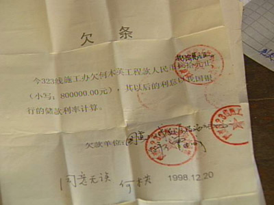 林景惠:“民工投勞力,還有一些小老板也代資。比如我們請(qǐng)下面的包工頭,給我們完成工程的話,我們第二步就給股份。第二步就答應(yīng)在一年內(nèi)加銀行利息,加倍的銀行利息給他們。”據(jù)調(diào)查,自1999年底新股東進(jìn)入后,合作三方股東打起了官司,一些包工頭和民工代表為追回工錢,也將丙方告上了法庭,2001年,韶關(guān)中級(jí)人民法院執(zhí)行了財(cái)產(chǎn)保全,凍結(jié)了收費(fèi)站的1300萬元收費(fèi)款。林景惠:“有約定完工過后就付清所有我的工資部分,付清80%剩余的部分就在六個(gè)月之內(nèi)全部付清。1996年6月份我就全部把工做完了,做完了就一直等錢,一直等到現(xiàn)在。”記者:“一年以后工程完工了,但是你們卻沒有能力來支付民工這筆錢?”林景惠:“沒辦法。說實(shí)話對(duì)民工這個(gè)欠款我是深表同情的,所以從1996年開始全部收入基本上來講,就給這個(gè)工程隊(duì)我們都有付的清單!庇浾咴谑召M(fèi)站采訪時(shí),正碰到幾個(gè)民工拿著判決書來討工錢。在調(diào)查中記者發(fā)現(xiàn),有些判決已生效3年多,但民工還是沒有拿到工錢。記者:“這些錢全部就給了施工隊(duì),付給施工隊(duì),施工隊(duì)總共欠了才一千多萬。你這兩千多萬都給他了,那就應(yīng)該說是早還清了,實(shí)際上你們欠了不止一千多萬!泵窆ぃ骸皩(shí)際不止,所欠的款項(xiàng)應(yīng)該是達(dá)到了三千萬吧,兩千多萬、三千萬左右。”
