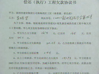 丙方:“當(dāng)時(shí)我們約定以后,我們實(shí)際收到廣西方590萬,還有410萬沒有到我們賬號(hào)。做工程的過程當(dāng)中,由于縣里面自己擴(kuò)大規(guī)模,增加工程量,使我們的工程越做越大。越做工程量越大費(fèi)用也越高!庇浾撸骸巴顿Y成本就在原來的基礎(chǔ)上增加多少呢?”丙方:“按照我們現(xiàn)在最小的工錢量是5500萬,增加了1800多萬左右。”林景惠告訴記者,工程完工后所欠民工工資實(shí)際已經(jīng)達(dá)到3000多萬元,他們每月都在逐漸還民工的工錢,那么,為什么還有1300萬元工程款拖到現(xiàn)在還沒有付清,是因?yàn)?000年初深圳市國資辦的一紙文件把股權(quán)轉(zhuǎn)到了深圳市深發(fā)貿(mào)易公司名下,新股東沒有履行支付民工工錢的職責(zé),造成了今天還拖欠民工工資。