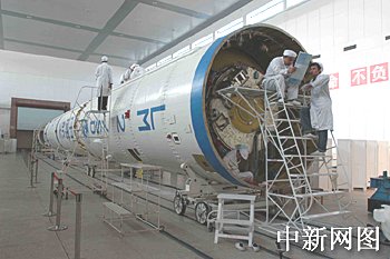 圖:"長征二號丙"改進(jìn)型運(yùn)載火箭在總裝廠房進(jìn)行系統(tǒng)測試