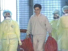中新網(wǎng)12月30日電 據(jù)臺(tái)灣媒體報(bào)道,臺(tái)灣今年冬季首位感染SARS的詹姓中校,今天(30日)凌晨零時(shí)五十分許,在兩名身著隔離衣的護(hù)士陪同下,悄悄步出臺(tái)北和平醫(yī)院,隨后立即由家人駕車(chē)接離,結(jié)束其十三天的醫(yī)療。