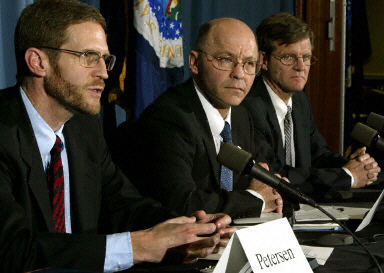 美國農(nóng)業(yè)部官員肯尼思·彼得森(左)29日在華盛頓的發(fā)布會上說,調(diào)查人員發(fā)現(xiàn)有問題的牛肉已經(jīng)流入華盛頓州、俄勒岡州、加利福尼亞州、內(nèi)華達(dá)州、阿拉斯加州、夏威夷州、愛達(dá)荷州、蒙大拿州和關(guān)島的食品零售市場。美國食品和藥物管理局說,有關(guān)部門已經(jīng)下令在這些地區(qū)范圍內(nèi)回收總計(jì)4.5噸的牛肉。