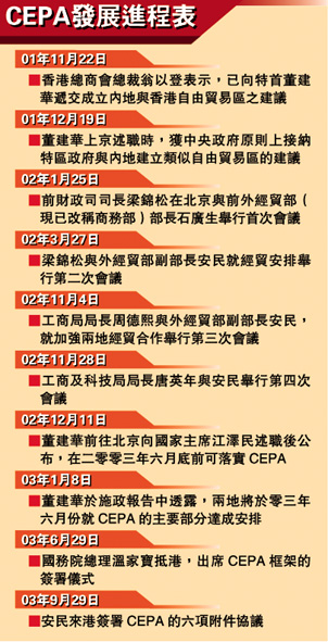 在二零零三年六月簽署的CEPA包括貨物貿易、服務貿易和貿易投資便利化三部分。其中,貨物貿易部分規(guī)定,自二零零四年一月一日起,對輸往內地的二百七十三種原產于香港的貨物實行零關稅。(戴慶成)