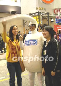 香港除夕新年期間,銅鑼灣繁華街頭出現(xiàn)派發(fā)“安全套”的廣告玩偶,吸引不少女士圍觀合影,港人正忘卻不快的一年,將久違了的高漲情緒,歡快迎接2004年。作者:洪少葵