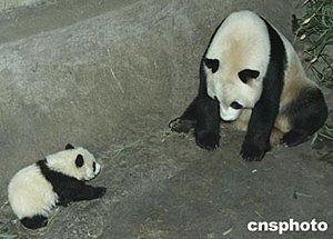 2004年新年鐘聲敲響前的2003年12月31日晚,出生整整一百三十天的北京動物園大熊貓“甜甜”在媽媽“妞妞”期待的目光和輕聲的召喚聲中,搖搖晃晃一步一步向前走!疤鹛稹2003年8月24日在北京動物園出生,目前的體重已經(jīng)從出生時的150克增長到8,060克,預(yù)計(jì)在半周歲后斷奶離開媽媽獨(dú)立生活。中新社記者:任晨鳴