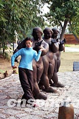 一位游客假日在福州閩江公園新建的藝術(shù)雕塑《健身操》前搖擺行走。沿閩江兩岸的閩江公園修建了不少別致的雕塑,已成為市民休閑游覽的好去處。作者:鄭祚聲
