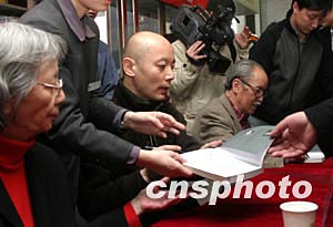 一月三日,大陸著名影星葛優(yōu)與父親葛存壯(右)在北京圖書大廈為母親施文心(左)所著的《都趕上了》一書簽名售書。該書記述了葛優(yōu)的成長歷程及戀愛、婚姻、家庭的秘聞趣事。中新社記者:史利