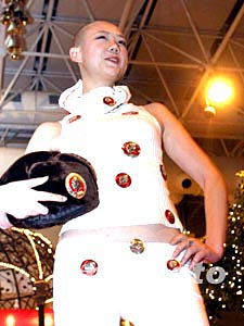 新春佳節(jié)即將來臨,各種聯(lián)誼活動不斷推新,一位光頭模特在聯(lián)誼會上披掛毛主席像章上臺表演。中新社記者:史利