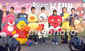 歌星梁漢文、方力申、組合Shine兩人、林嘉欣、鄭中基(左二起)1月6日在香港金鐘添馬艦舉行之《環(huán)球嘉年華2003/4》出席“Neway終極K Fun嘉年華”演唱會(huì)作表演嘉賓,獲環(huán)球嘉年華主辦機(jī)構(gòu)送上大型毛公仔。作者:鄧慶樂