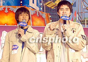 組合Shine兩人1月6日在香港金鐘添馬艦舉行之《環(huán)球嘉年華2003/4》出席「Neway終極K Fun嘉年華」演唱會(huì)作表演嘉賓,并呼吁歌迷上臺(tái)游戲。作者:鄧慶樂