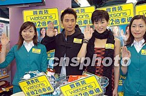 藝員胡杏兒、吳卓羲1月8日在香港出席《屈臣氏最低價保證》宣傳活動,與兩位店員共同展示最低價保證手勢。作者:鄧慶樂