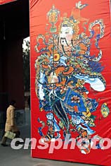 農(nóng)歷新年將至,北京傳統(tǒng)廟會(huì)舉辦地——地壇公園正在為春節(jié)廟會(huì)忙碌,公園大門上張貼的巨幅門神年畫營(yíng)造出傳統(tǒng)佳節(jié)的獨(dú)特氣氛。中新社記者:盛佳鵬