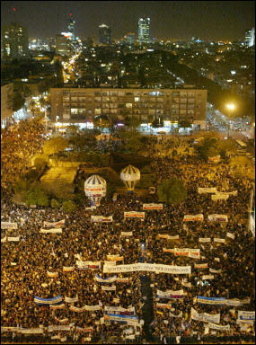同樣是上周日,約10萬名以色列人在特拉維夫集會(huì)示威,反對(duì)沙龍清除約旦河西岸的部分猶太定居點(diǎn)。