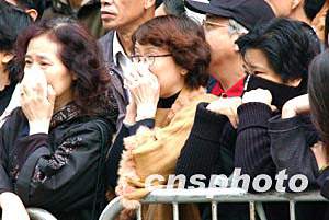 中新社香港一月十二日電(記者曉萍)患癌癥去世的香港著名藝人梅艷芳今日舉殯。大殮儀式于上午十一時開始,隨后布滿白色鮮花的靈車將靈柩送往柴灣哥連臣角火葬場火化。逾千名梅艷芳的歌、影迷在北角殯儀館外夾道送別,場面哀痛。
