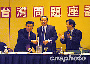 中國國臺辦副主任王在希(中)十四日在紐約皇后區(qū)法拉盛與旅美臺胞就臺灣問題進行座談,并向僑團贈送了“神舟五號”飛船的模型。左為紐約亞美文化協(xié)會會長黃哲操,右為紐約中國和平統(tǒng)一促進會會長花俊雄。作者:趙海燕