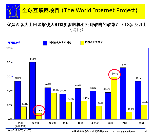 這里唯一的例外是中國,雖然由于提問方式的不同,中國的問卷沒有給出中間選項,這種強(qiáng)制性的提問方式會增加回答者的總數(shù),但是,中國持贊成態(tài)度的網(wǎng)民要多于持反對態(tài)度的網(wǎng)民則是不爭的事實,顯示出網(wǎng)民對網(wǎng)絡(luò)的政治監(jiān)督作用的有一種強(qiáng)烈的期待。這一結(jié)論和兩年前的調(diào)查結(jié)果完全吻合。