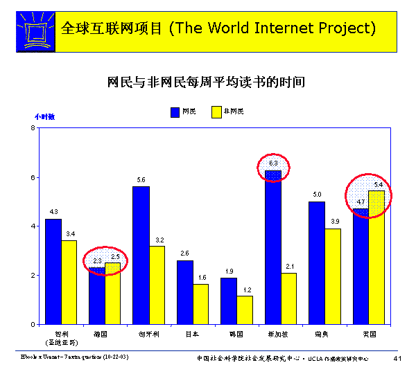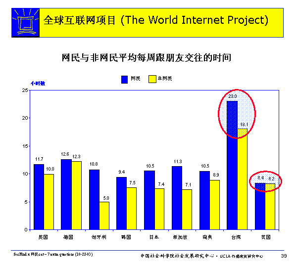 在所有調(diào)查的國家里,網(wǎng)民平均每周與朋友交往的時(shí)間多于非網(wǎng)民。而只有在美國和德國,網(wǎng)民和非網(wǎng)民與朋友交往的平均時(shí)間基本是一致的。