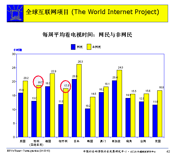 在WIP所有調(diào)查國家里,網(wǎng)民平均看電視時(shí)間少于非網(wǎng)民。網(wǎng)民和非網(wǎng)民看電視情況差異最大的國家是智利和匈牙利,兩國網(wǎng)民每周平均看電視時(shí)間比非網(wǎng)民少5.7個(gè)小時(shí),日本網(wǎng)民每周看電視時(shí)間比非網(wǎng)民少5.3個(gè)小時(shí),美國網(wǎng)民每周看電視時(shí)間比非網(wǎng)民少5.2個(gè)小時(shí)。