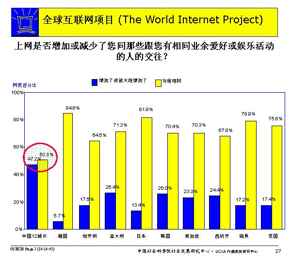 然而,還是有相當數(shù)量的網(wǎng)民認為使用互聯(lián)網(wǎng)增加了他們同跟他們有相同業(yè)余愛好或相同娛樂活動的人的交往;這樣的網(wǎng)民在中國最多,47.2%被調(diào)查的中國互聯(lián)網(wǎng)網(wǎng)民認為互聯(lián)網(wǎng)增加了增加或極大的增加了交往。