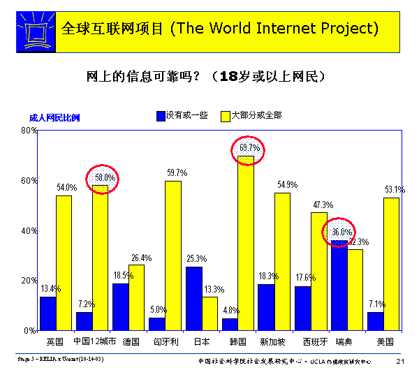 韓國網(wǎng)民最信任網(wǎng)上信息,69.7%的網(wǎng)民認為網(wǎng)上的大部分信息都是可靠的。