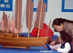 “紀(jì)念鄭和下西洋600周年仿真航模展覽”一月十七日在蘇州吳作人藝術(shù)館展出。展覽共展出了近四十件模型,包括仿鄭和下西洋船隊(duì)模型,各種現(xiàn)代海船、艦艇模型以及圖片資料吸引了前來參觀的中小學(xué)生。作者:蔣振江