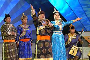 最為奇特的是來自內(nèi)蒙古大草原的男女兩組呼麥歌手,他們的呼麥唱法,起源于宗教,已有近兩千年歷史。一位歌手一張嘴,同時(shí)發(fā)出高、中、低三種聲音,分別表示對(duì)天、地、神的尊敬。這種獨(dú)特古老的演唱方式,曾盛行于蒙古大汗的宮庭,后來才逐漸傳入民間。