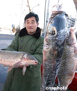 中國(guó)農(nóng)歷春節(jié)即將來(lái)臨,一名商販在北京懷柔區(qū)的春節(jié)市場(chǎng)向顧客介紹懷柔水庫(kù)的巨型魚(yú)。此種魚(yú)小則五、六斤,大到二、三十斤,且大多鮮活。中新社記者:任海霞