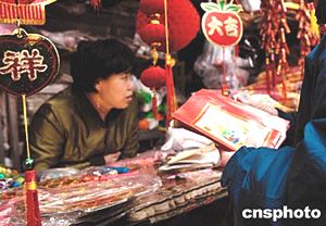 大批北京市民在農(nóng)歷甲申候年春節(jié)來臨前,突擊采購拜年禮品。北京天外天小商品批發(fā)市場內(nèi),制作精美的紅包等成為人們節(jié)前采購的熱點。中新社記者:鄒憲