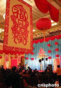 北京人民大會(huì)堂春節(jié)前夕舉行聯(lián)歡會(huì),明亮的大廳內(nèi)高懸福字,慶祝中國(guó)農(nóng)歷猴年的到來。中新社記者:毛建軍