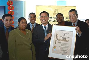 亞美商業(yè)發(fā)展中心和紐約市合作二十日舉行紐約帝國大廈亮燈儀式,慶祝中國農(nóng)歷新春,紐約州、市官員等都前往祝賀。圖為中國駐紐約總領(lǐng)事劉碧偉(右三)和亞美商業(yè)發(fā)展中心總裁王章華(右一)共同接受紐約市議員的祝賀。作者:趙海燕