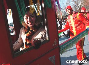 中國(guó)農(nóng)歷大年初一,北京各大公園別具特色的廟會(huì)活動(dòng)紅紅火火地開(kāi)始了,大觀園內(nèi)仿照中國(guó)古代新娘出嫁坐花轎的游樂(lè)項(xiàng)目,引來(lái)許多平日坐慣轎車(chē)的現(xiàn)代女性,鉆進(jìn)花轎品嘗舊時(shí)“新娘”滋味。中新社記者:王麗南