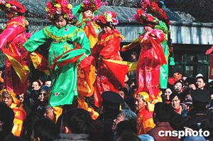 在北京大觀園廟會(huì)上,來(lái)自山西省大同地區(qū)民間特有的“撓擱”表演,吸引無(wú)數(shù)市民駐足觀看!皳蠑R”是在一個(gè)壯漢身上綁起一根兩米高的鐵桿,頂端安有鐵座,化了妝的男童或女童綁坐在上面,被稱作“撓擱人”。中新社記者:王麗南