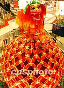 圖:香港一商廈內(nèi)醒目的“獅子滾繡球”