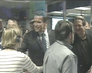 據(jù)美國有線新聞網(wǎng)消息,美國加州州長施瓦辛格(右三)在“機(jī)遇”號(hào)火星探測(cè)器成功登陸火星后,親臨指揮室向現(xiàn)場(chǎng)人員表示祝賀。(電視截圖)
