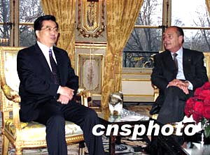 一月二十六日下午,正在法國進行國事訪問的中國國家主席胡錦濤與法國總統(tǒng)希拉克在愛麗舍宮舉行會談。作者:蔚中
