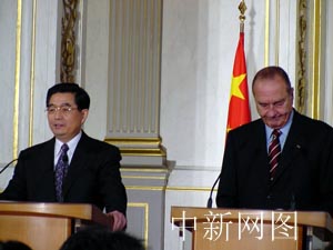 今天是中法建交四十周年紀(jì)念日,正在法國進(jìn)行國事訪問的中國國家主席胡錦濤和希拉克在巴黎進(jìn)行了正式會談,會談后雙方簽署了“中法聯(lián)合聲明”。該聲明強(qiáng)調(diào),中法兩國將深化全面戰(zhàn)略伙伴關(guān)系,致力于建立更加安全、更加尊重多樣性和更加團(tuán)結(jié)的世界。