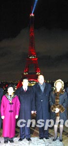 一月二十七日是中法建交四十周年紀(jì)念日,中國國家主席胡錦濤伉儷和法國總統(tǒng)希拉克夫婦二十七日晚上在法國巴黎埃菲爾鐵塔前留影紀(jì)念,該塔自二十四日晚開始至二十九日凌晨止,為表達(dá)法國對(duì)中國文化傳統(tǒng)的敬意,而舉行“鐵塔映紅”活動(dòng)——鐵塔被紅色射燈裝扮成了一座代表中國的“紅塔”。作者:成丁