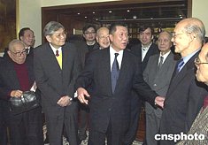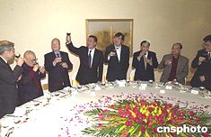 澳門(mén)特區(qū)政府二十九日在禮賓府舉行午宴,宴請(qǐng)澳門(mén)各新聞媒體,圖為行政長(zhǎng)官何厚鏵向出席午宴的嘉賓拜年。