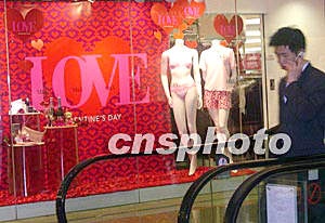 2月2日,香港一百貨公司櫥窗里寫上“LOVE”,并以性感內衣作招徠,象征濃情密意。雖然離2月14日的情人節(jié)還有些日子,但是商家的宣傳攻勢已經讓人感受到愛意撲面而來。作者:譚達明