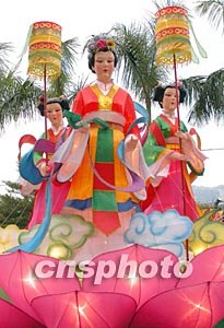 元宵佳節(jié)臨近,香港康文署在尖沙咀文化中心露天廣場舉行大型彩燈《華燈話西游》,圖為取材自《西游記》中的“西王母幡桃壽宴”,西王母慈祥地拿著玉如意站在蓮花上。作者:鄧慶樂