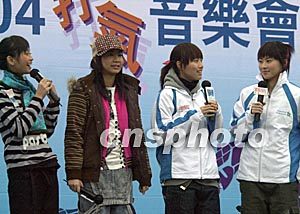 香港二月七日在維多利亞公園舉行“渣打馬拉松2004打氣音樂會”,人氣組合COOKIES成員在音樂會上演唱。中新社記者:錢興強(qiáng)