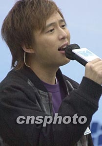 香港歌星鄧健泓,二月七日在香港維多利亞公園舉行的“渣打馬拉松2004打氣音樂會”上為歌迷演唱。中新社記者:錢興強(qiáng)