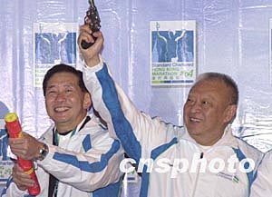 “渣打馬拉松2004”二月八日在香港舉行,香港特別行政區(qū)行政長官董建華、渣打銀行大中華區(qū)總裁王冬勝在起跑儀式上為馬拉松主持鳴槍禮。 作者:錢興強