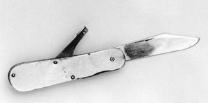 這把杜月笙生前所用的小手槍形似水果刀。杜月笙原本是水果攤學(xué)徒出身,擅削梨子,平時喜歡把玩削梨小刀。所以沒有人想到他手中的這把“水果刀”其實是一把微型手槍。這支6.35mm口徑的微型槍是在瑞士定造的,可以填裝一發(fā)子彈。杜月笙就可利用削水果的動作麻痹對方,然后出其不意擊發(fā)。兩米之內(nèi)具有絕對的殺傷力。