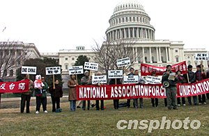 中新社華盛頓二月十二日電(記者余東暉)美國大華盛頓地區(qū)的華人和留學(xué)生十二日在國會(huì)山前集會(huì),并向一百六十多名國會(huì)眾參兩院議員遞交聯(lián)合簽名信,表達(dá)反對(duì)臺(tái)灣當(dāng)局搞“公投”和擔(dān)憂美中關(guān)系因此受到破壞的心聲。