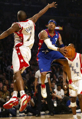 洛杉磯湖人隊(duì)的艾弗森在對戰(zhàn)西部全明星隊(duì)的弗朗西斯,兩名小個(gè)子球員上演空中舞蹈。