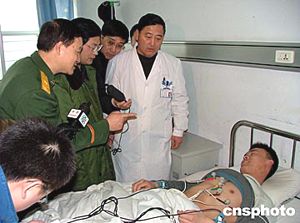 二月十五日十一時許,吉林市中百商廈發(fā)生火災。截至十六日上午,已知有五十三人喪生,另有七十人受傷被送往醫(yī)院接受治療。圖為國家安全生產(chǎn)監(jiān)督管理局和公安部消防局有關人員到醫(yī)院看望救火中受傷的消防隊員。作者:吳兆飛