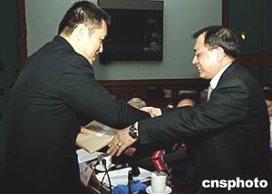 北京政協(xié)的香港、澳門委員2月17日與北京市代市長王岐山等高官座談。不少委員均關(guān)注正月十五密云發(fā)生的多人死亡事件,香港的馮柏棟委員(右)向北京市副市長張茅遞交了香港處理1993年蘭桂坊元旦悲劇調(diào)查及改進方案。中新社記者:任晨鳴