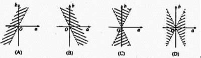 此題的完整解是(—b—>2—a—,且a≠0)。{證明:函數(shù)y=ax2+bx+a的圖像與x軸有兩個(gè)交點(diǎn),就是方程ax2+bx+a=0有兩個(gè)不同的實(shí)根。其充分必要條件是a≠0,且b2>4a2。即(—b—>2—a—,且a≠0)。}在圖A、B、C和D中,凡虛線均表示不屬于區(qū)域的邊界,凡相鄰而不同斜率的陰影線均表示相鄰而不連通的區(qū)域,這是符合慣例的。[關(guān)于區(qū)域的定義,可見(jiàn)《數(shù)學(xué)》,第二冊(cè)(上),普通高級(jí)中學(xué)教科書(shū),p.58: