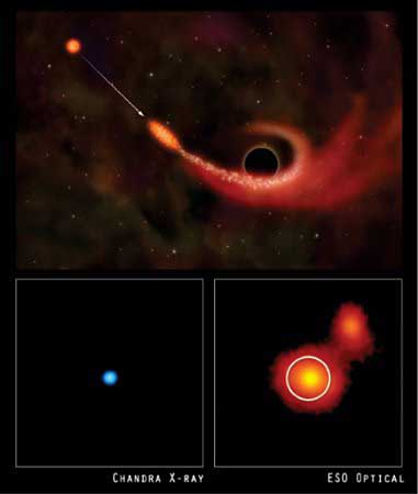 天文學(xué)家估計(jì),上述黑洞的質(zhì)量是太陽(yáng)的一億倍,而被撕裂的恒星則和太陽(yáng)相若。黑洞吞噬了該恒星大約1%的物質(zhì),將其余的部分重新拋入太空。