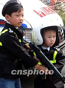 香港西區(qū)警區(qū)聯(lián)同中西區(qū)滅罪行委員會(huì),二月二十二日舉行滅罪跑嘉年華活動(dòng),該活動(dòng)的目的是透過有益的活動(dòng)宣傳滅罪訊息并推廣健康生活,圖為兩位小朋友對展示的警務(wù)器械頗感興趣。中新社記者:錢興強(qiáng)